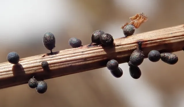Lamproderma echinosporum er en kuleformet, kortskaftet eller uskaftet slimsopp. Arten er metallglinsende, har mørke flekker på overflaten og har lange pigger på sporene. Dette er en vårart som forekommer på dødt gress og visne urter i snøsmeltingen.
