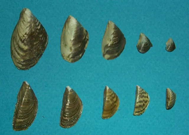 Sebramusling Dreissena polymorpha har små, fingerneglstore skall, ofte med sikksakkmønster.
