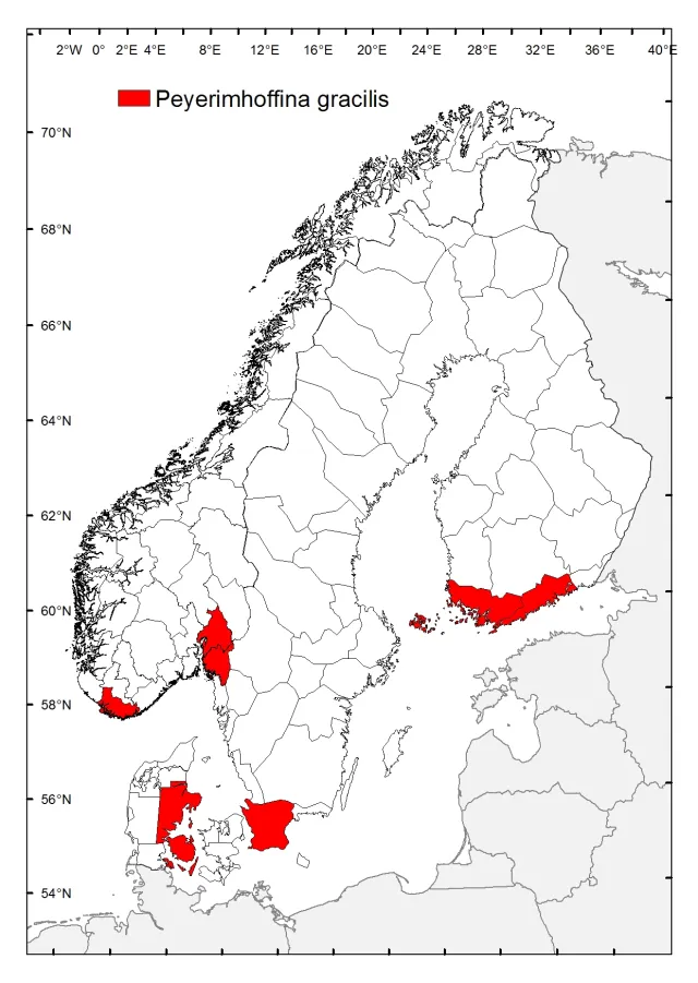 Peyerimhoffina gracilis ble registrert for første gang i både Norge, Sverige, Finland og Danmark etter år 2000.