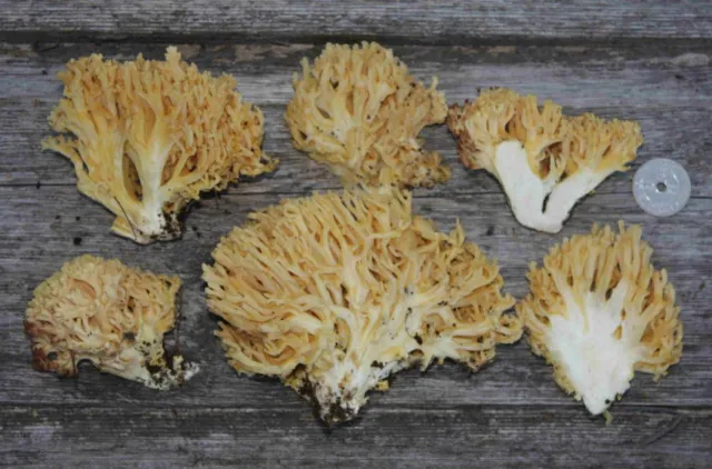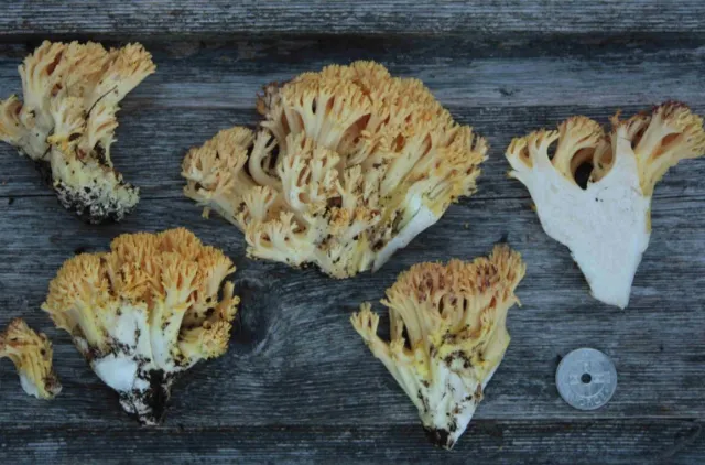 Fruktlegemene er ofte bredere enn høye, med uregelmessige, ofte sprikende greiner og kort stamme som gjerne er lite synlig på grunn av mye skjell/rudimentære greiner. De rent gule til oransjegule fargene på greinene står i kontrast til det hvite kjøttet, men gulfargen avblekes fort. Karakteristisk er pudderaktig sterkt (gull)gule og mer vedvarende flekker i nedre greinvinkler. Kjøttet er blankt, fuktig til klebrig, og kan bli glassaktig oppsvulmet og gelatinøst med alder. Lukten er maisaktig ved gjennomskjæring, men ofte (sterkt) reddikaktig på overflaten.