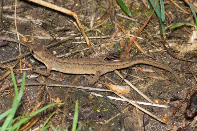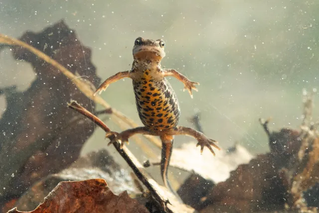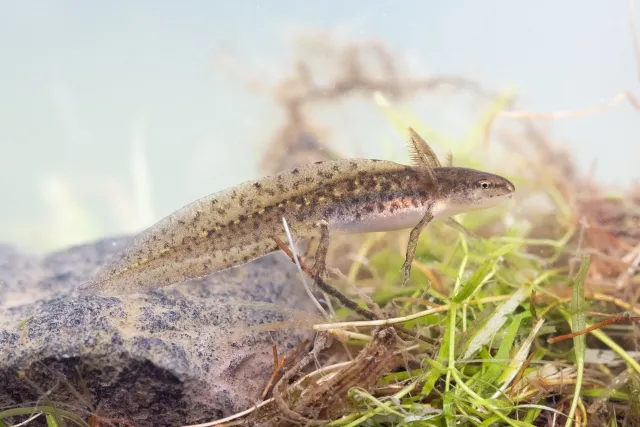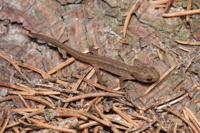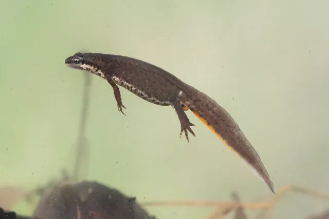 Denne vesle småsalamanderen har nettopp gått på land. I nakken sees fortsatt merkene etter gjelleduskene.