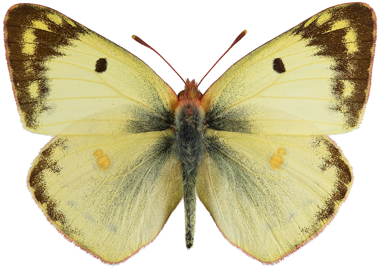 Hannen er blekt gul mens hunnen er grønnlig hvit, sjeldnere blekt gul som hannen. Langs ytterkanten av framvingen og fremre del av bakvingen løper det et mørkt kantbånd. Innenfor dette er det et mørkt bånd som er kraftig utviklet ved framvingespissen og bakover er redusert til utydelige flekker. Framvingen har en stor, svart midtflekk, og bakvingen har en uregelmessig oransje midtflekk. Vingene har røde frynser.