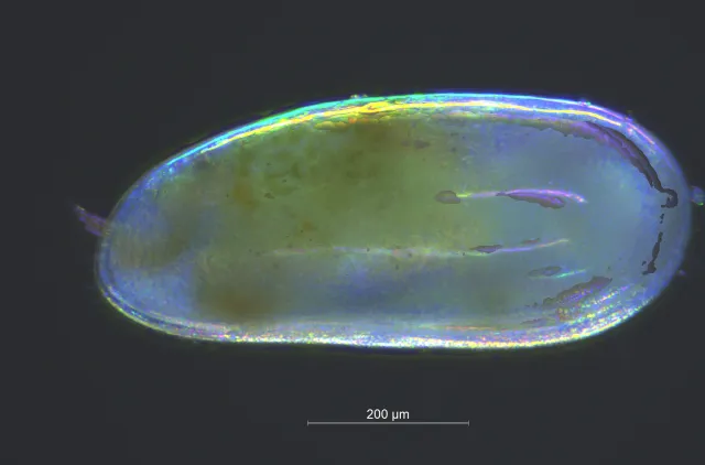 Darwinula stevensoni. Den langstrakte, tubeformete sideprofilen er typisk.