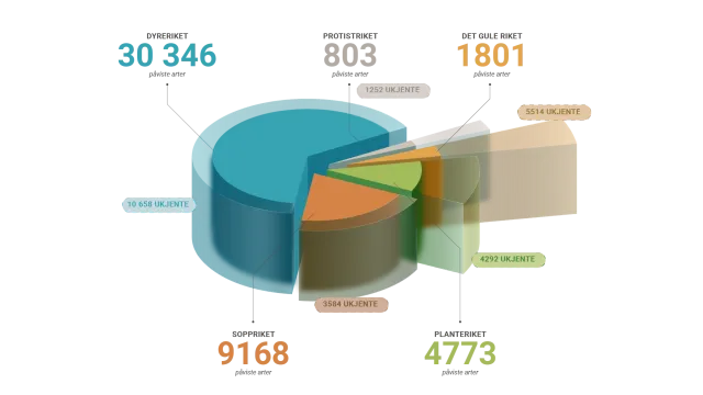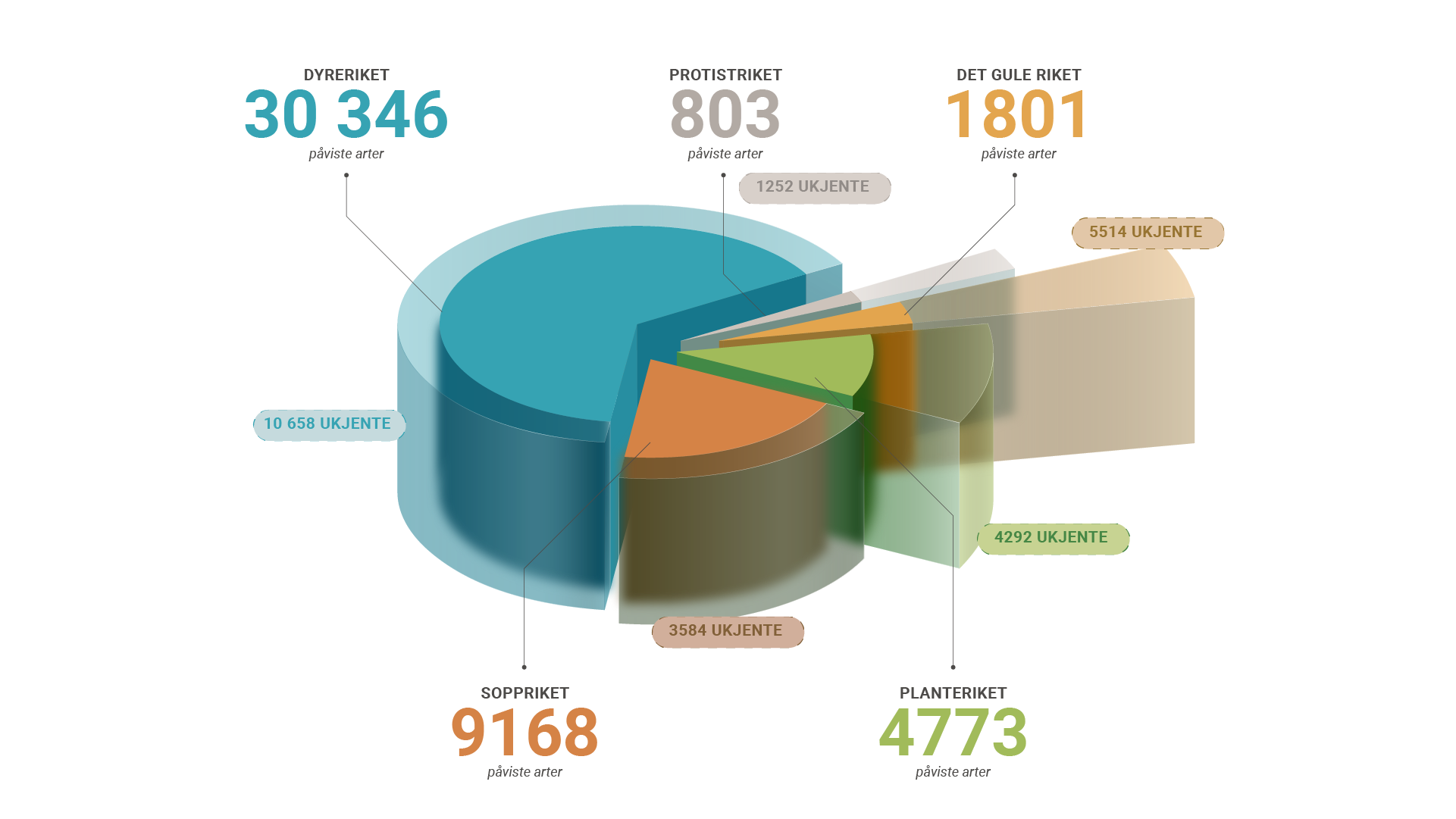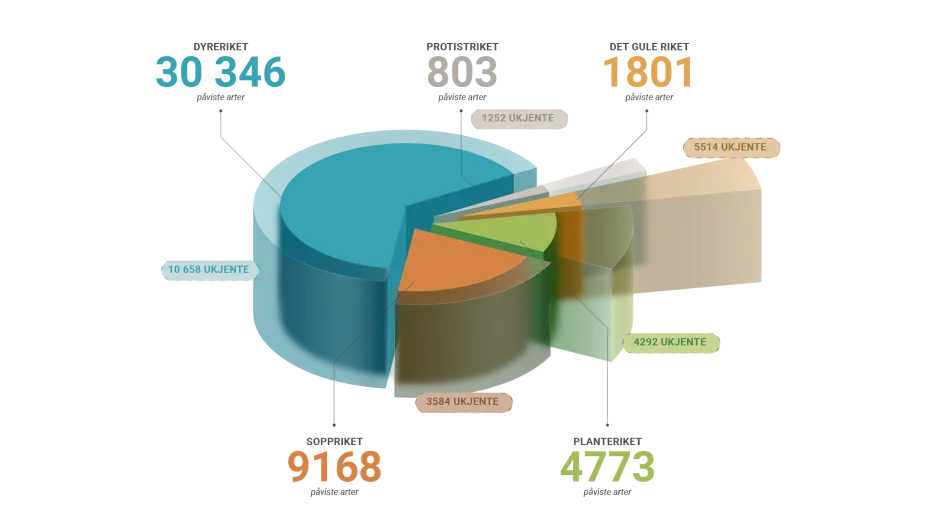 Den nye kunnskapsstatusen viser at vi i Norge har 46 891 arter som er påvist. Av disse lever 8 298 i havet, 4 356 i ferskvann og 34 237 på land. Forskerne som har utarbeidet rapporten estimerer at det fremdeles finnes 25 299 ukjente arter, slik at det totale antall arter i Norge blir 72 190.