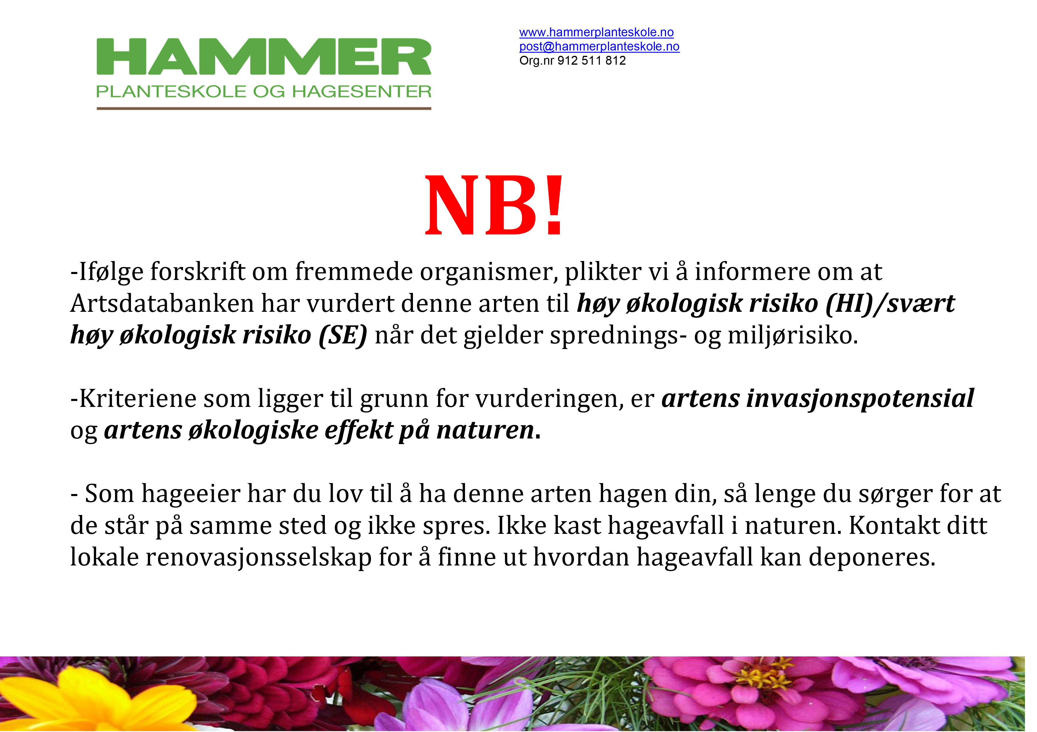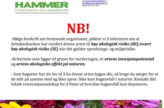 - I tillegg til selve plakatene i hagesenteret, prøver vi også å snakke med kundene som vurdere å velge planter som representerer denne type risiko. Vi mener det er viktig å veilede kundene om plantevalg, og da har vi også mulighet å snakke om arter som har spredningsfare, avslutter Hammer.