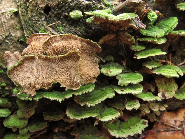 - Trichaptum pargamenum (Fr.) G. Cunn., Polystictus friesii (Klotzsch) Cooke, Trametes friesii (Klotzsch) G. Cunn., Trichaptum biformis (Fr.) Ryvarden, Polystictus albovestidus Lloyd, Polystictus pargamenus (Fr.) Fr., Polystictus pergamenus (Fr.) Cooke, Coriolus pargamenus (Fr.) G. Cunn., Coriolus pergamenus (Fr.) G. Cunn., Hirschioporus pargamenus (Fr.) Bondartsev & Singer, Polyporus biformis Fr., Polyporus friesii Klotzsch, Polyporus pergamenus Fr., Trametes pargamenus (Fr.) Kotl. & Pouzar, Microporellus friesii (Klotzsch) Ryvarden, Polystictus biformis (Fr.) Fr