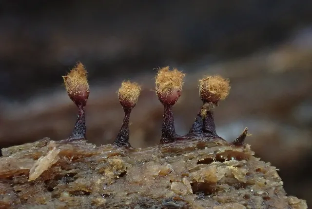 Arten har tydelig skaftede, mørkebrune, rødbrune til nesten svarte sporokarper med et peridium som etter hvert sprekker opp langs lyse linjer, men med få linjer og plater. Totalhøyde er opptil 4 mm. Skaftet er furet og fylt med amorft materiale (ikke celle-lignende strukturer). Kapillitietrådene består av frie, uforgrenede elaterer som har tydelig spiralornamentering der spiralene er glatte. Elaterene har en meget lang (opptil 100 µm), gradvis avsmalnende spiss. Arten har sporer som måler (8,5–)9,5–10,5(–12) µm og er tett ornamentert med små vorter (som i noen grad flyter sammen, men som er vanskelig å se i lysmikroskop).
