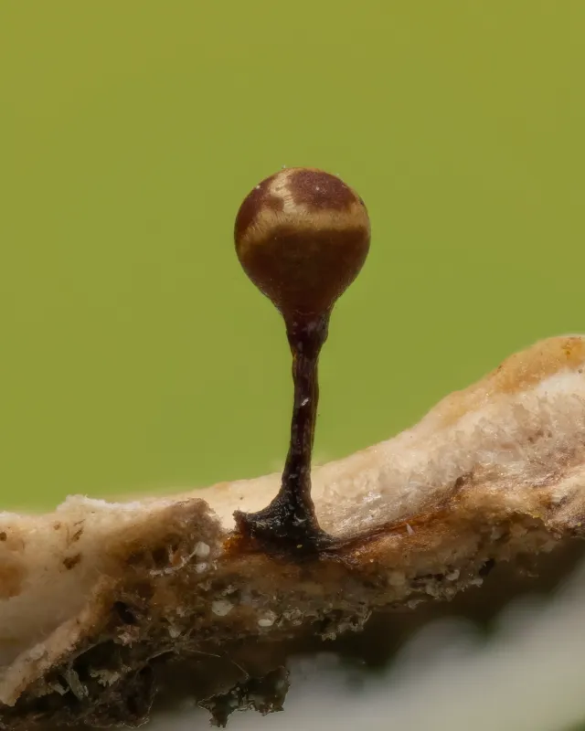 Arten har enkeltstående, langskaftede, mørkt gulbrune til mørkebrune sporokarper med et peridium som etter hvert sprekker opp langs distinkte lyse linjer. Totalhøyde er opptil 1,5 mm. Skaftet er furet og fylt med amorft materiale (ikke celle-lignende strukturer). Kapillitietrådene består av frie, i hovedsak uforgrenede elaterer som har tydelig spiralornamentering der spiralene er glatte. Elaterene har en relativt kort (typisk 30 µm) avsmalnende spiss, av og til delt i to korte spisser. Arten har sporer som gjerne er litt uregelmessige i form, måler (8,5–)9–10,5(–12,5) µm og er ornamentert med litt spredte vorter som gjerne flyter sammen i grupper på 2–3 (kan være vanskelig å se i lysmikroskop).