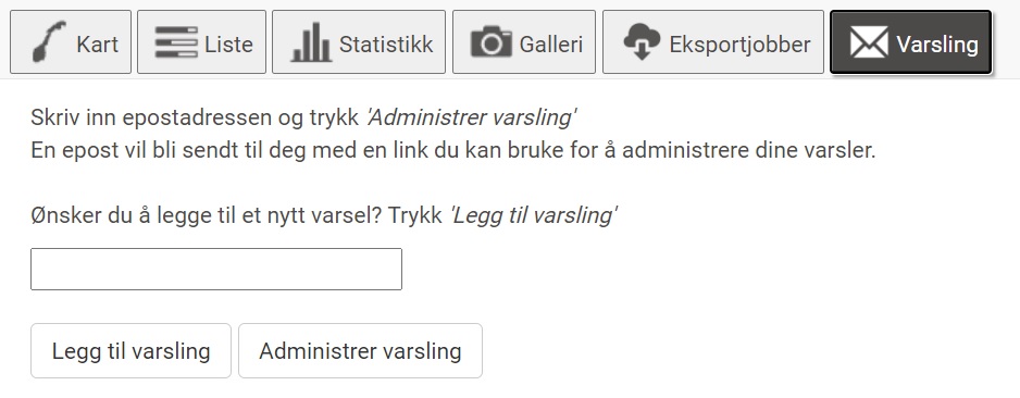 2) Legg inn e-postadressa di og trykk Opprett varsel dersom du vil legge til eit nytt varsel, eller trykk Administrer varsel for å sjå dei varsla du allereie har. Det er nødvendig å bekrefte innlogging ved å trykke på ei lenke som du får tilsendt på e-post.