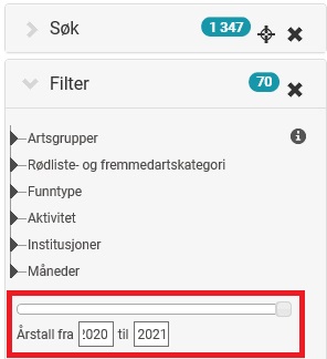 Merk at varsel i utgangspunktet blir sendt ut for alle nye observasjonar i Artskart som tilfredsstiller søkekriteria. Eldre observasjonar som blir lagt til i Artskart etter at varselet er oppretta, vil derfor bli inkludert. Om du ikkje ønsker dette, så kan du spesifisere årstal under Filter i søkefeltet i artskart slik illustrert nedanfor.