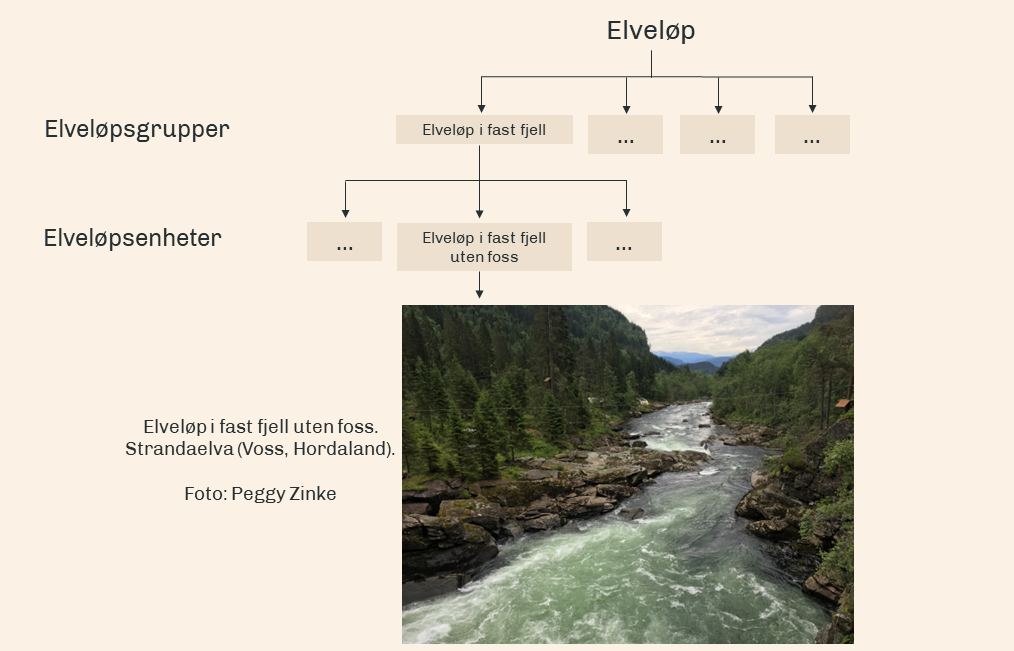 Typeinndelingen av elveløp har to nivåer; elveløpsgruppe og elveløpsenhet (elvetype). Typesystemet åpner for grovsortering av elveløp basert på dominerende prosess og lengdeform. Systemer består av 19 elveløpstyper fordelt på sju grupper. Av disse nitten elveløpstypene er sytten formet av naturlige prosesser. Innenfor en elveløpsenhet skal det være relativt liten variasjon i egenskaper som helning, vannhastighet, form etc., og samme geomorfologiske prosess(er), som f.eks. is, vann, vind m.m. skal ha formet og være aktiv(e) i hele elveløpet.