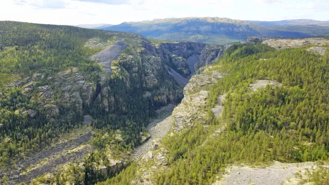 Jutulhogget sett fra øst. Stort gjel dannet ved bresjøtapping. Noe av avsetningene kan ses ved munningen nærmest fotografen. Mellom Alvdalen og Rendalen, Hedmark.