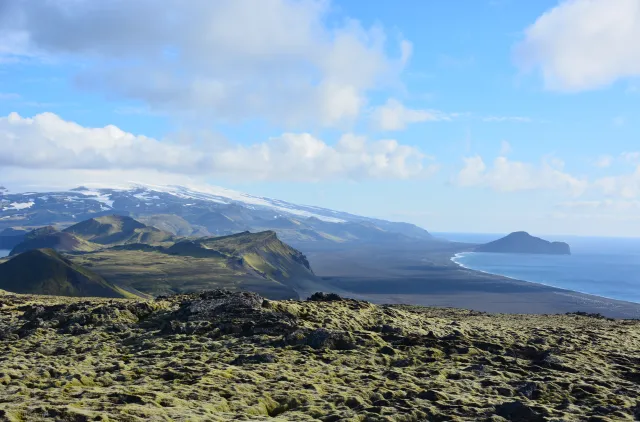 Utsikt mot midt-Jan og Pukkelryggene, beerenberg i skydekket og Eggøya til høyre (som ble dannet under vulkanutbrudd i 1736). Jan Mayen.