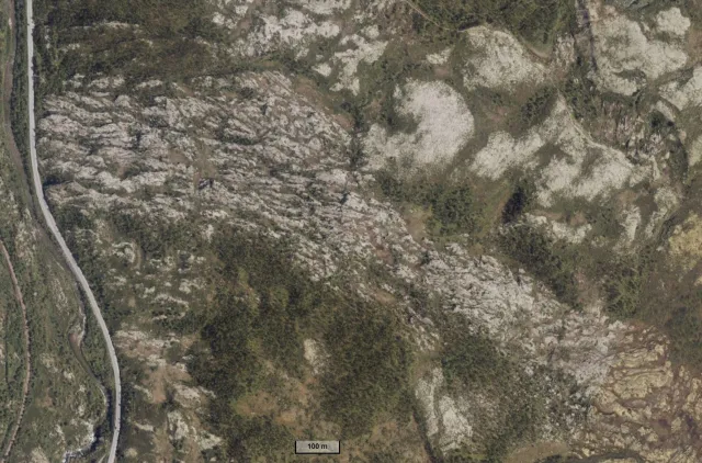 Et spylefelt rett sør for Kongsvoll i Oppdal kommune i Trøndelag viser et typisk bilde av spylefelt der smeltevannet har vasket vekk det som var av løsmasser i området. På denne måten står spylefeltet frem med en klar kontrast til omgivelsene med sin mangel på løsmassedekke og dermed sparsomme vegetasjon. Kongsvoll i Oppland, Trøndelag. Ortofoto fra Norge i Bilder