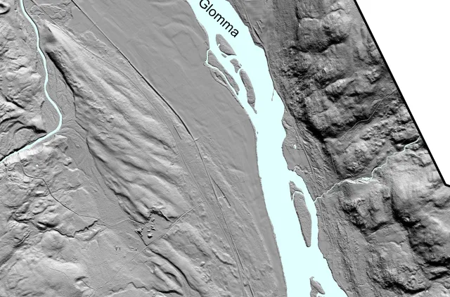 Flombanke fra bresjøtapping (skyggerelieff fra Kartverket). Øksna, Elverum, Hedmark. Kilde: hoydedata.no