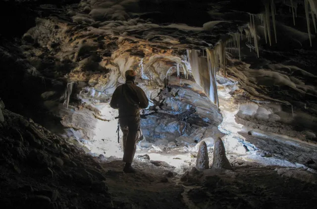 Bildet viser grottepassasje med dryppstein (stalaktitter i taket og stalagmitter på golvet) og en person med grotteutforskningsutstyr. Okshola-Kristihola, Fauske, Nordland.