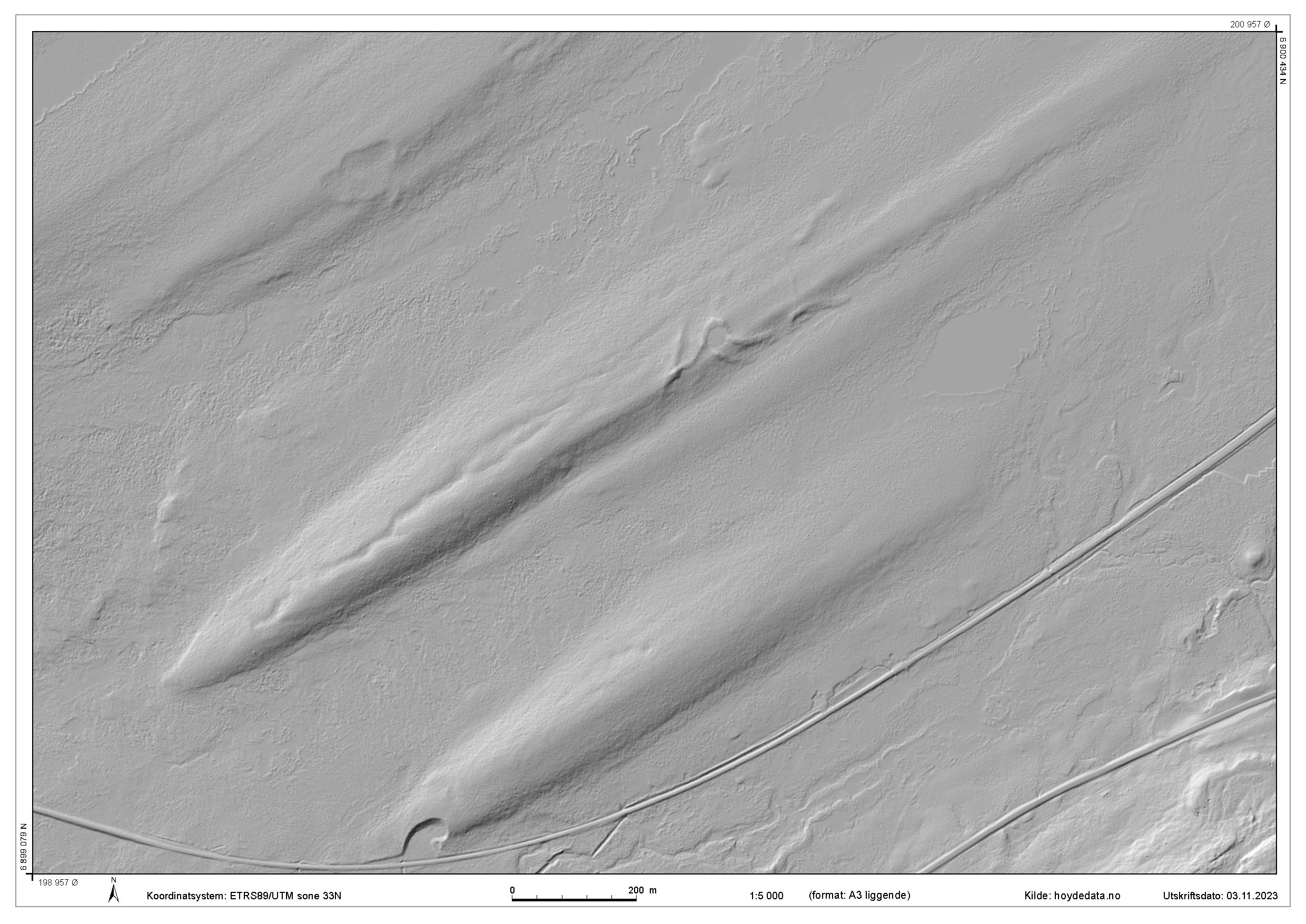 Skyggerelieffbildet viser de to største drumlinene i Fokstumyrene på Dovre. Den nederste ligger helt inn til jernbanesporet og har et lite grustak i den butte enden. Man kan også se små smeltevannspor og en avsetning av grus, en liten esker som ligger oppe på den den samme drumlinen og smeltevann-spor/mini-eskere langs ryggen av den midtre drumlinen. Kilde: hoydedata.no