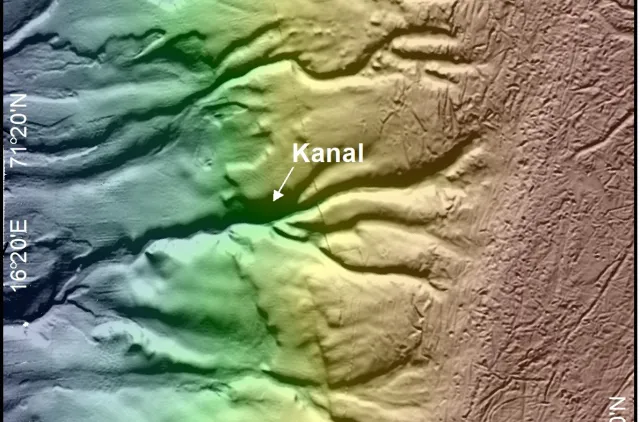 Kanaler på Eggakanten, Tromsøflaket. Kanalene er inntil 20 m dype. Figuren er modifisert fra Bellec mfl. (2016) Atlas of Submarine Glacial landforms: Modern, Quaternary and Ancient. Geological Society, London, Memoirs, 46, 381-382. http://doi.org/10.1144/M46. Tromsøflaket nord for Nord-Troms.