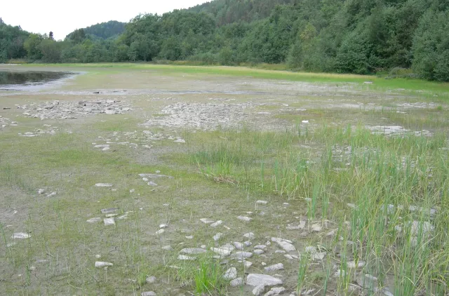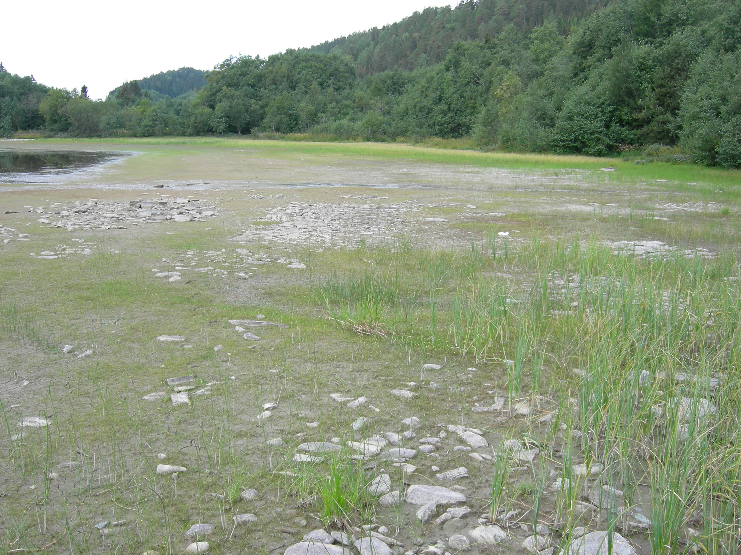 Bløtbunn i ferskvann, silt- og leirbunn i ferskvann, eksemplifisert ved siltdominert evje i langgrunn sjø ved lav vannstand (Snåsavatnet ved Hammer, Snåsa, Trøndelag).