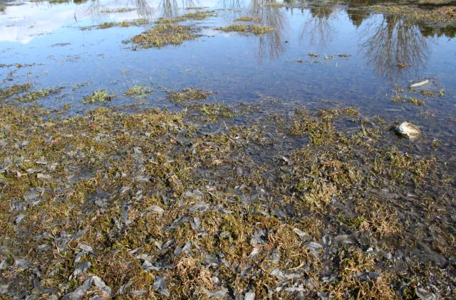 Dødt organisk materiale i ferskvann, mose- og karplantegytje i en ferskvannsdam på Tautra (Frosta, Trøndelag). Grunntype FS05-02 Dy og gyttje.
