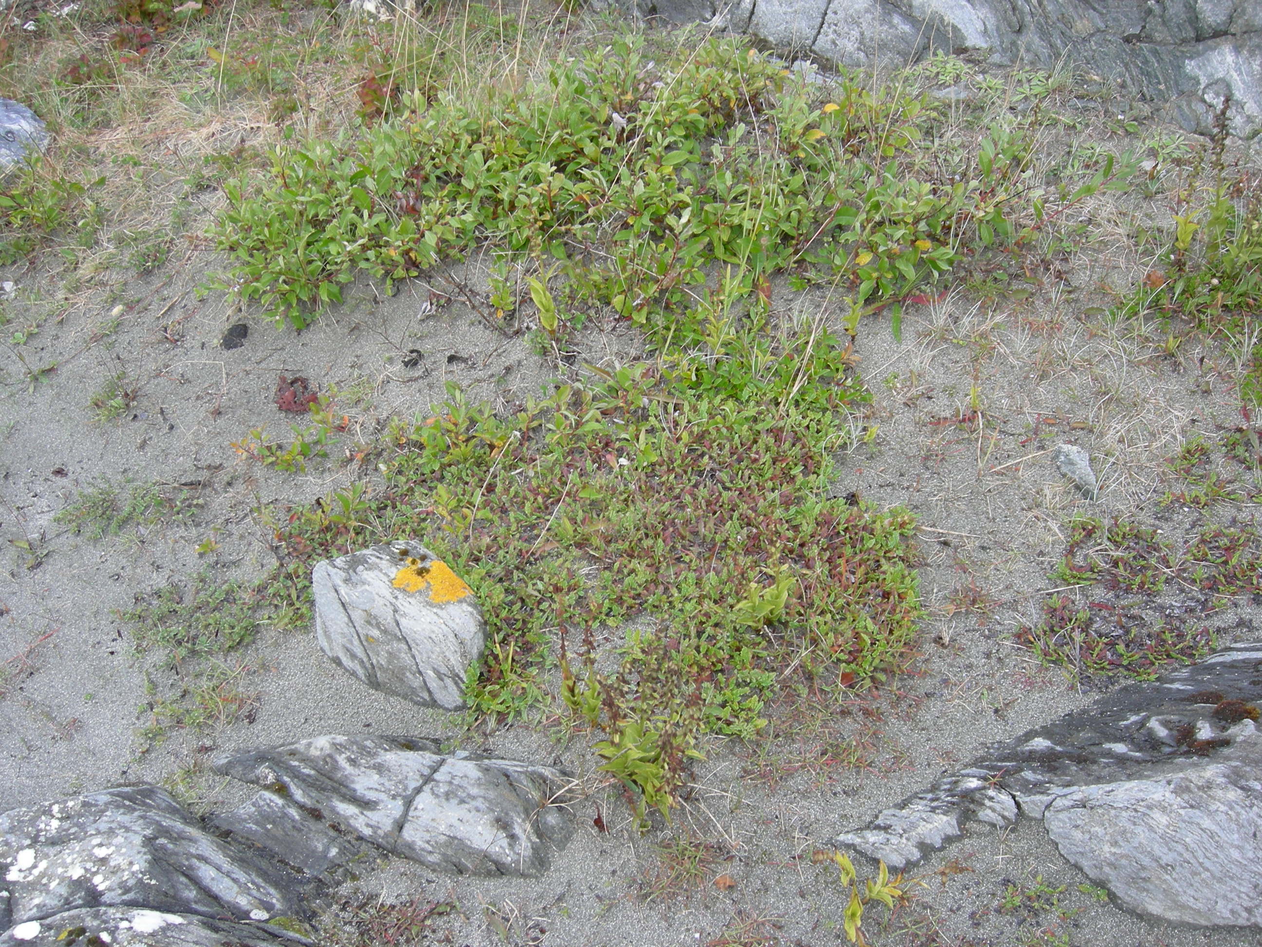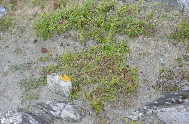 Finere uorganiske substrater på land, eksemplifisert ved oversandet berg et stykke innenfor fjæresonen, dominert av reinrose (Dryas octopetala) (Årdalssanden, Leka, Trøndelag).