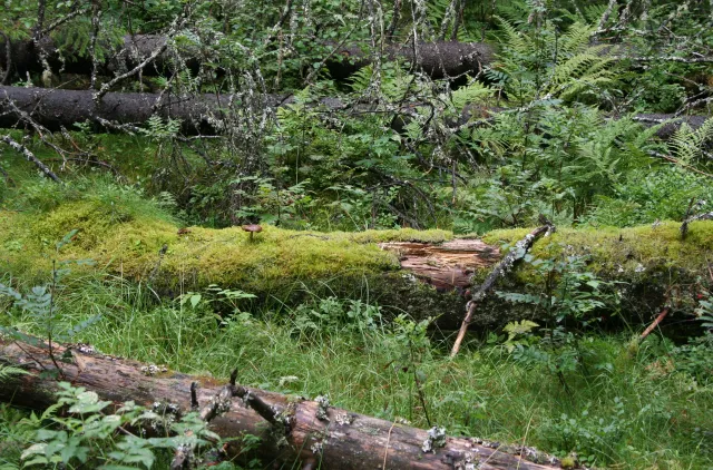 Ved-livsmedier. Liggende gran (granlæger). Grunntype TS06-03 I stubbe eller liggende død ved. Estenstadmarka, Trondheim, Trøndelag.