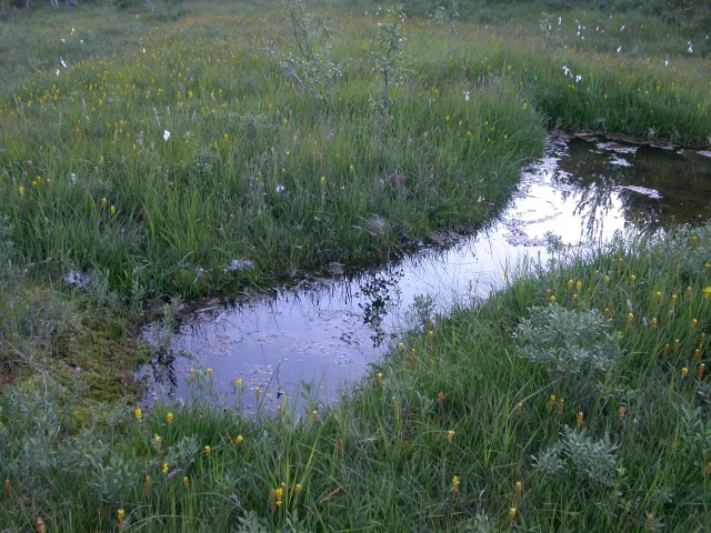 Gjøl-bunn på fast torv fra svakt hellende, svakt intermediær (KA_d) flarkmyr ved Risfjell i Gjerstad kommune. Risfjell, Gjerstad, Aust-Agder.