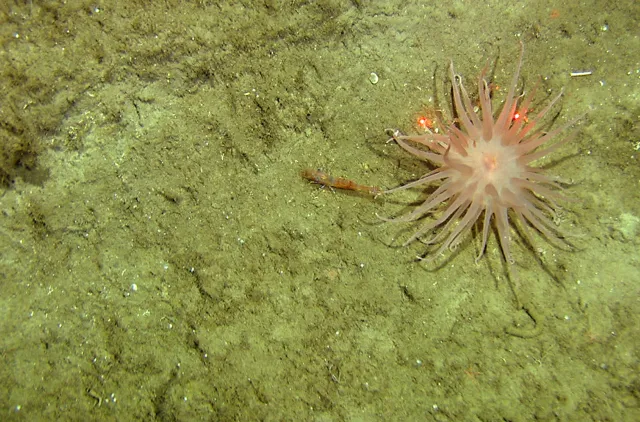 Afotisk saltvann-sedimentbunn. Løs afotisk bunn med kontinuerlig oksygentilgang. Leirholdig bunn på ca. 350 m dyp (Ingøydypet utenfor Finnmark), med muddersjørose Bolocera tuediae. Ei reke kan også ses i bildet.