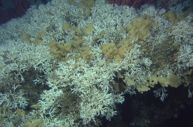 Korallrev bygget opp av kalkskjelettet til øyekorallen Desmophyllum pertusum. Malangsgrunnen utenfor Troms.
