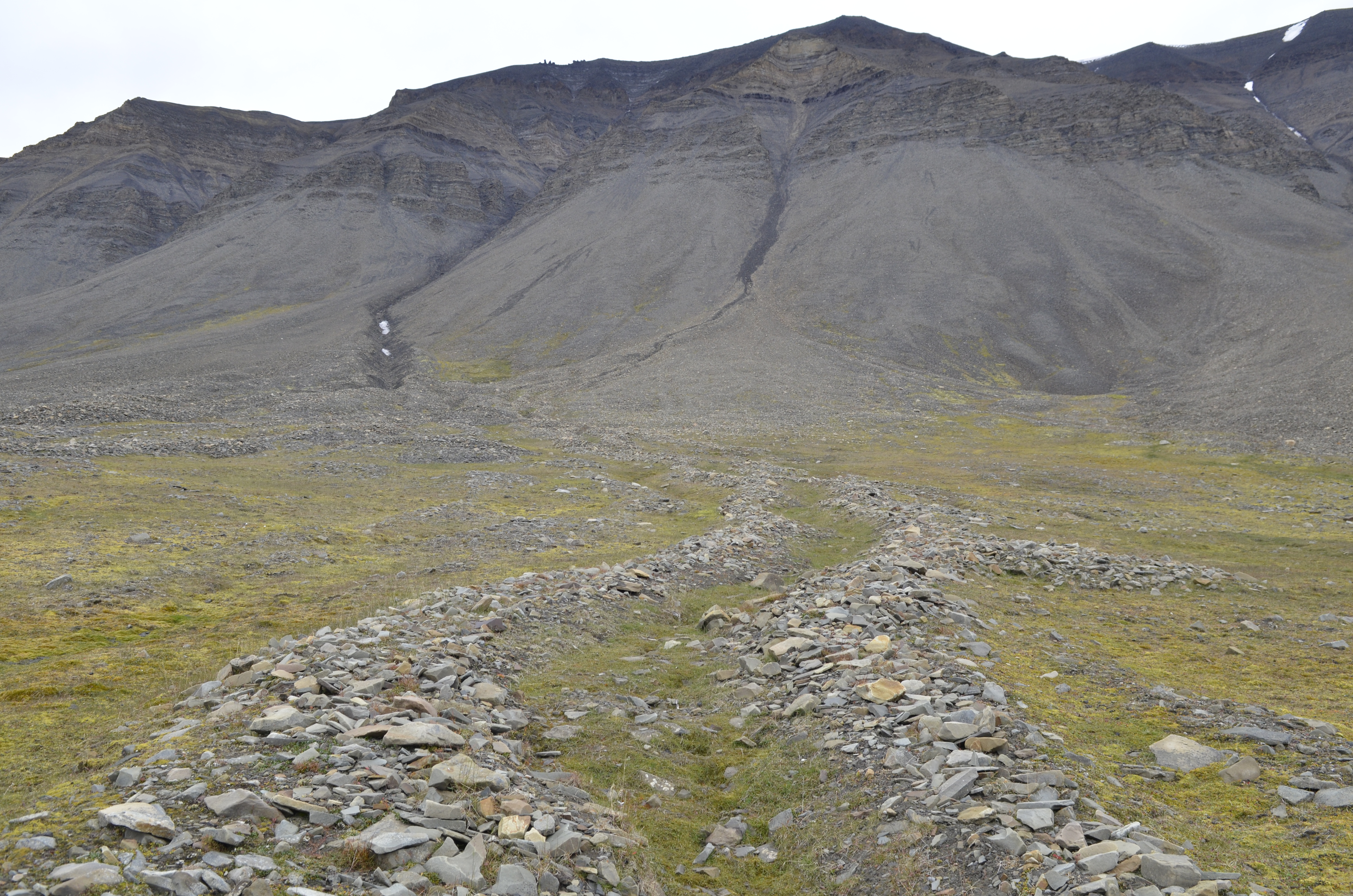 Bildet viser en vifte der deler er preget av flomskred (flomskredvifte) og deler av snøskred (snøskredvifte). Gjennom flomskredviften renner et flomskredløp. Svea, Svalbard.