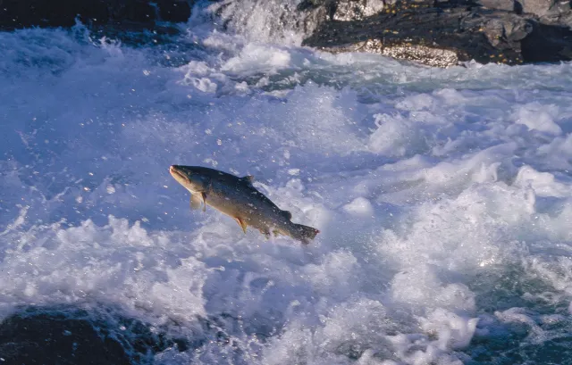 Elvevannmasser med fisk i Hunderfossen i Øyer kommune. Hunderfossen, Øyer, Oppland.