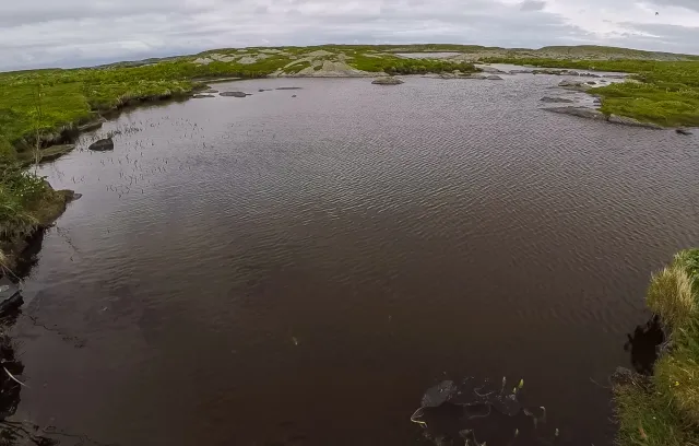 Limniske vannmasser i en dam på Selvær preget av naturlig gjødsling fra trekkende hvitkinngås *Branta leucopsis*. Selvær, Træna, Nordland.
