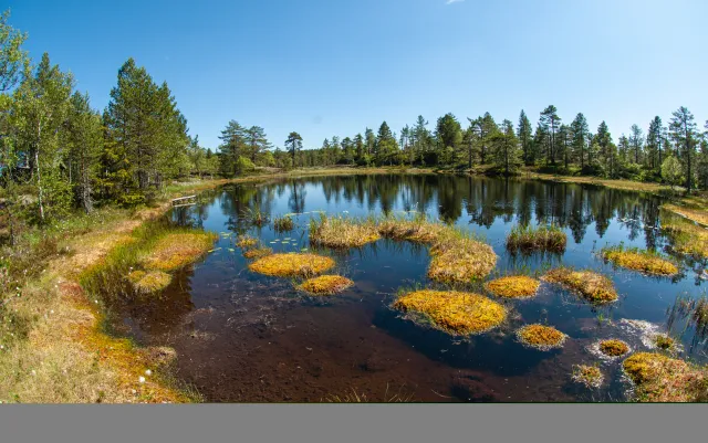 Innsjøvannmasser preget av kronisk kjemisk påvirkning i Vakkertjern Lier kommune (2 600 m2, 0,2 mg Ca/l, pH 4,3). Storsteinsfjell, Lier, Buskerud.
