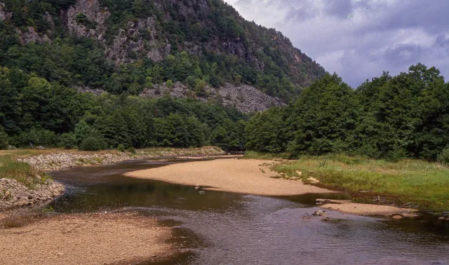 Elvevannmasser preget av kronisk kjemisk påvirkning i Lygna før kalking startet på begynnelsen av 1990-tallet (Lyngdal kommune). Lygna, Lyngdal, Vest-Agder.