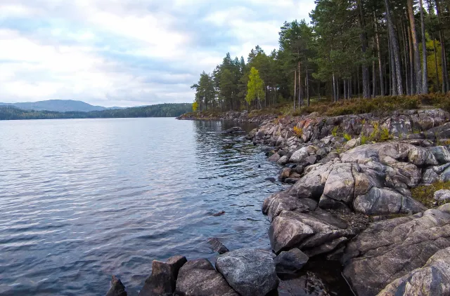 Noe kalkfattig (3,9 mg Ca/l) og eksponert fast strandkant i Væleren i Ringerike kommune.