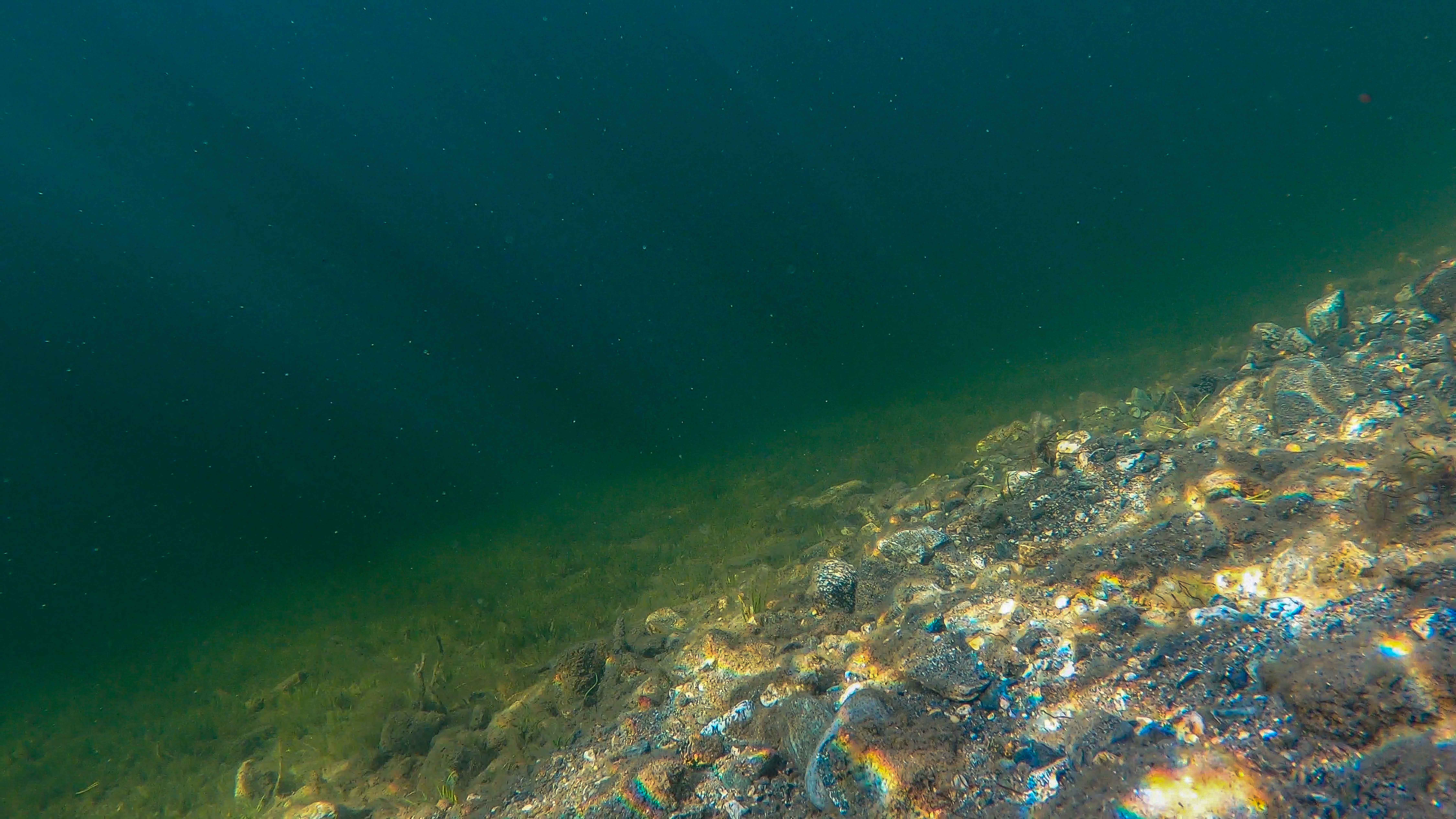 Noe kalkfattig (2,8 mg Ca/l) plantebelte med grus (D50 = 50 mm) i Espedalsvatnet i Gausdal kommune.