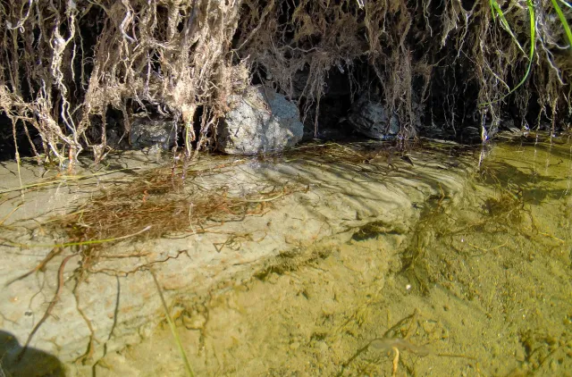 Kalkrik (6,6 mg Ca/l) innsjø-sedimentbunn av leire (DK_A) i strandkanten i Dokkadeltaet nord i Randsfjorden.