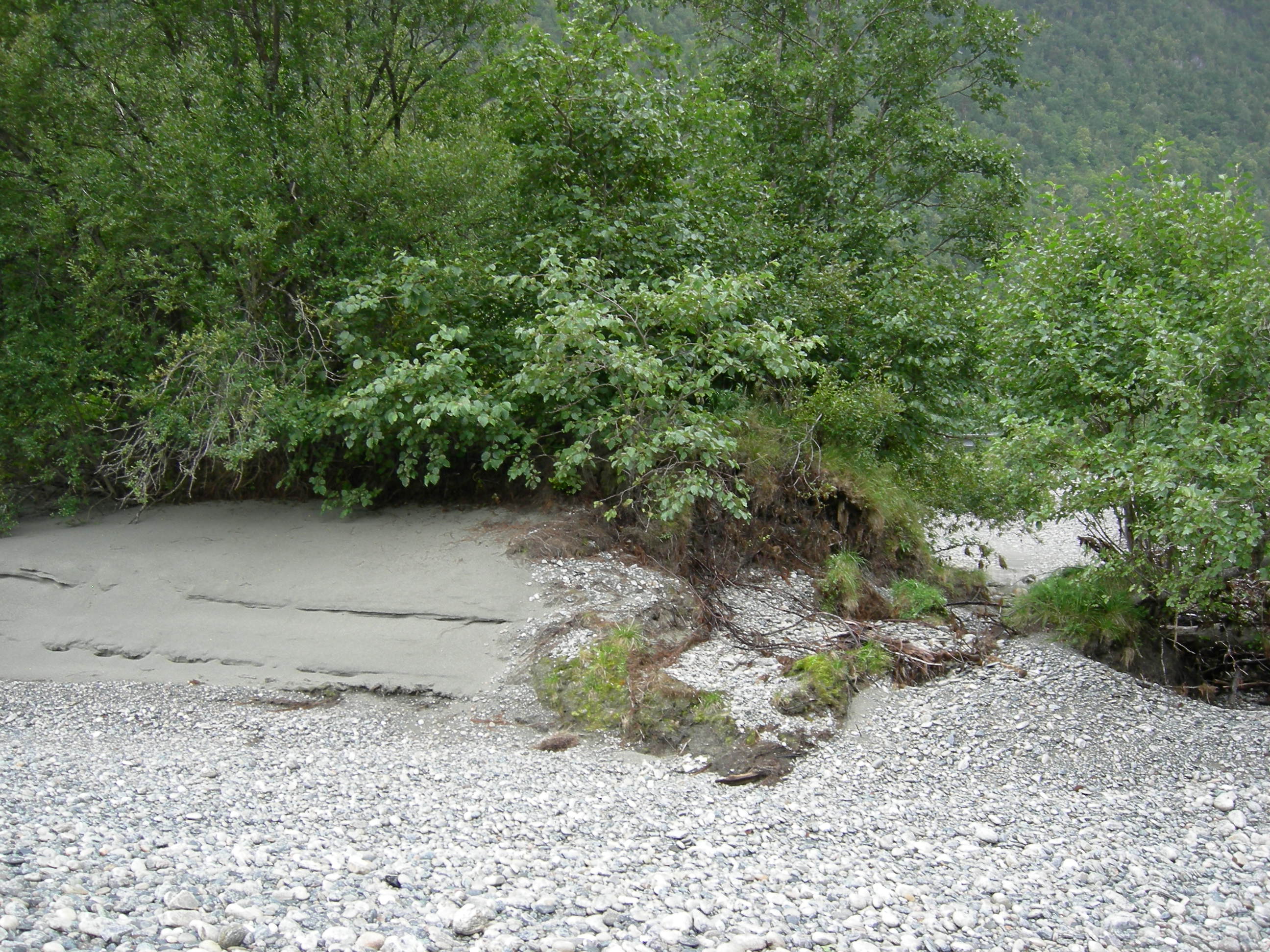 Erosjonskant på sandbunn. Romfo, elveører i Driva N for Gjøra, Sunndal, Møre og Romsdal.
