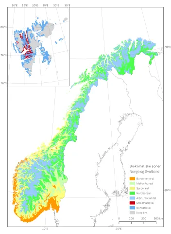 Kunnskapsgrunnlag Inndelingen i sju trinn kalt soner på fastlandet følger tradisjonen etter Ahti et al. (1968), med de tilpasninger som er gjort i inndelingen av Norge i 'vegetasjonssoner', først av Dahl et al. (1986) og seinere av Moen (1998), med to unntak: Det er ikke skilt ut noen nemoral sone langs kysten av Agder (dette området er inkludert i den boreonemorale sonen), og det er ikke skilt ut noen arktisk kratt-tundrasone langs kysten av Finnmark. Soneinndelingen understøttes av multivariat analyse av et stort datasett med hovedvekt på klimatiske variabler (Bakkestuen et al. 2008), som identifiserer den bioklimatiske sonegradienten som en av to hovedgradienter i klimarelatert variasjon på det norske fastlandet (inkludert øyene). Den bioklimatiske soneinndelingen av Svalbard er basert på Elvebakk (1999, 2005a, 2005b), men de to nordarktiske sonene langs NiN 2-gradienten 6SX er slått sammen til én sone i NiN 3 (se Figur 1).