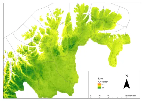 Figur 2 viser resultatene av modelleringen av bioklimatisk variasjon utført av Bakkestuen et al. (2008) for det aktuelle området.