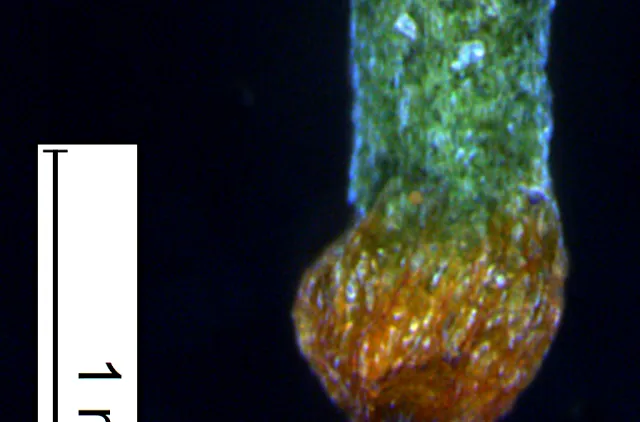 Fuktig tue med sporofytter med hette. Hetta (kalyptra) er uten fliker ved basis.
