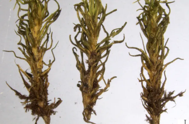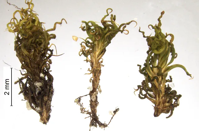 Tørre skudd av var. tortuosa med vridde og svakt krusa blad.