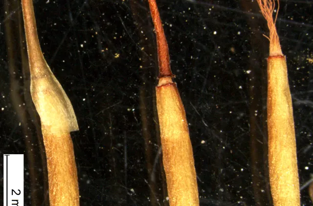 Stadier i sporehusutvikling, fra venstre, sporehus med hette, sporehus med lokk (uten hette) og sporehus med peristomtenner (hette og lokk falt av).