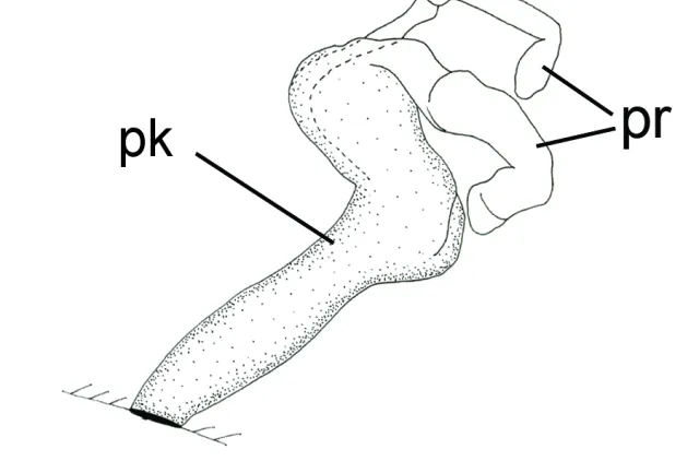 Det hannlige reproduktivsystemet, målestokk = 250 μm. Forkortelser: pk: peniskammer, pr: prostata.
