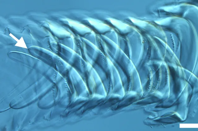 Radula (Lysmikroskopbilde), målestokk = 25 μm.