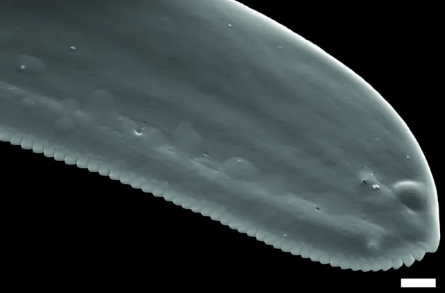 Skallets dorsalside (SEM), målestokk = 0,5 mm.