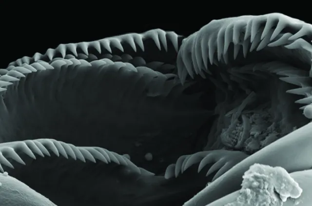 Detalj av sidetannen (SEM), målestokk = 2 μm.