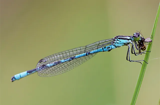 Hann av spydblåvannymfe Coenagrion hastulatum med bytte. Arten er vår vanligste og mest utbredte vannymfe. Den ligner flere andre arter, men hannen kan vanligvis kjennes igjen på kombinasjonen av grønne øyne, sparformet svart tegning på andre bakkroppsledd, og spydspisslignende tegning på tredje bakkroppsledd.