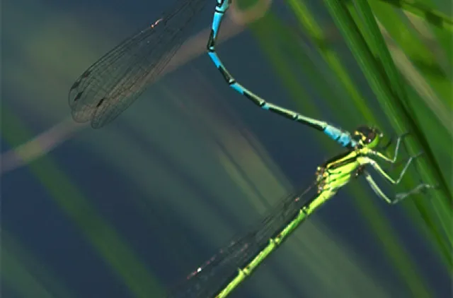 Spydblåvannymfe Coenagrion hastulatum i tandem. Hunnen (nederst) har vanligvis gulgrønn grunnfarge og overveiende svart ryggside. Hun bestemmes sikrest på halsskjoldets utforming.