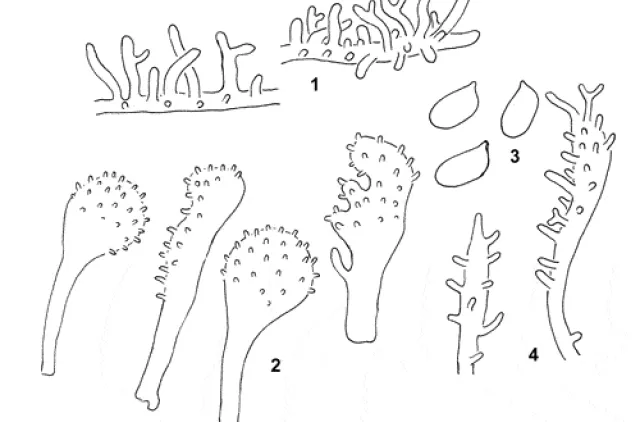 1. Hatthudshyfer, 2. Cheilocystidier, 3. Sporer, 4. Caulocystidier.